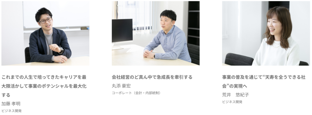 我々が挑戦している”人々が天寿を全うする社会の実現”は容易ではありません。この高い壁に立ち向かいながら、「何かを成し遂げたい」「とにかく成長したい」と思っていただける皆さんと、新しい社会を一緒に創っていけることを楽しみにしております。