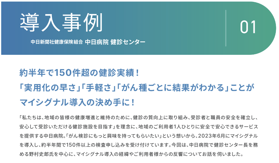 「マイシグナル®︎」は、2022年2月のサービス開始以来、全国の総合病院、健診施設、クリニックなど、さまざまな医療機関に導入されてきました。開始から2年が経過し、巡回健診や企業健診への組み込みを行う医療機関も増え、より幅広い場面での活用が進んでいます。また、この検査は特別な設備や人材を必要とせず提供できるという点も取り組む医療機関が増えている理由の一つです。Craifは今後も、医療機関にも受検者にも負担が少ない検査として「マイシグナル®︎」を推進し、がんの早期発見や早期治療に貢献してまいります。「マイシグナル®︎」導入医療機関一覧はこちら(*2)