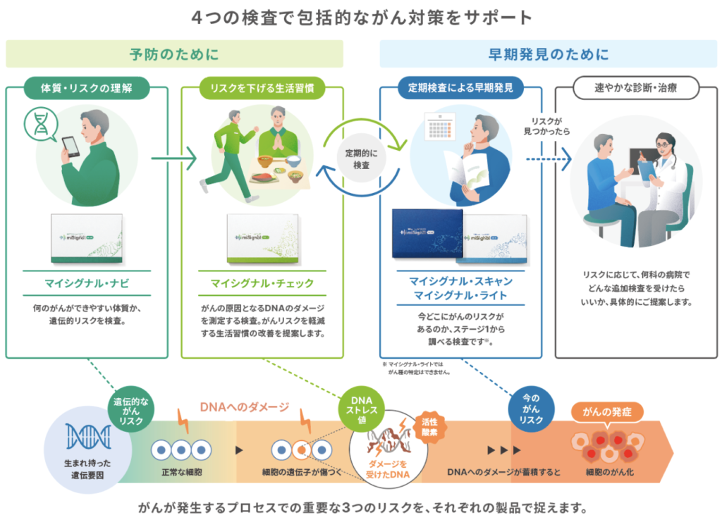 がんは長年に渡る生活の中でDNAにダメージが蓄積し、ある日突然発症する病気です。そのため、一度の検査で完結する「点」の発想ではなく、連続的な「線」で対策することが重要です。「マイシグナルシリーズ」は「線」のアプローチによるがん対策を、尿や唾液を提出するだけの簡便な検査で実現した革新的なサービスです。4つの検査を通じて、自らの体質的なリスクを知り、日々のDNAのダメージをモニタリングすることで発症を予防し、それでも防ぎきれないがんを早期発見することを一気通貫でサポートし、誰もが気軽に検査を受け、がんの予防と早期発見を促進することを目指しています。