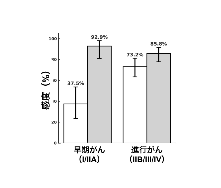 ・早期ステージでも高精度を実現:本検査法は、機械学習モデルを用いた解析によって、高精度にすい臓がんを検出することができました。早期段階のすい臓がんでも高い検出精度を示しました。