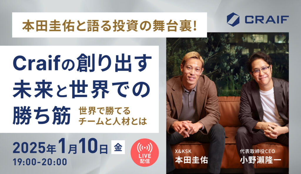 1/10実施決定!「本田圭佑と語る投資の舞台裏!Craifの創り出す未来と世界での勝ち筋」 〜世界で勝てるチームと人材について、本田圭佑×Craif CEO小野瀨のトークライブを生配信〜