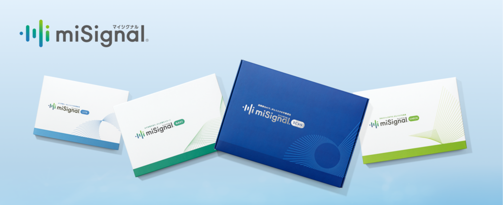 「マイシグナルシリーズ」は、予防と早期発見につなげる、がんリスク検査です。このシリーズはマイクロRNA×AIでがんリスクを高精度に評価する検査「マイシグナル・スキャン」、より手軽にがんリスクを評価する検査「マイシグナル・ライト」、がんに特化した遺伝子検査「マイシグナル・ナビ」、DNAダメージをモニタリング・予防につなげる検査「マイシグナル・チェック」で構成されています。4つの検査を通じて、自らの体質的なリスクを知り、日々のDNAのダメージをモニタリングすることで発症予防をサポート。それでも防ぎきれないがんを早期発見することを一気通貫でサポートし、がんの予防と早期発見を促進することを目指した包括的ながん対策です。