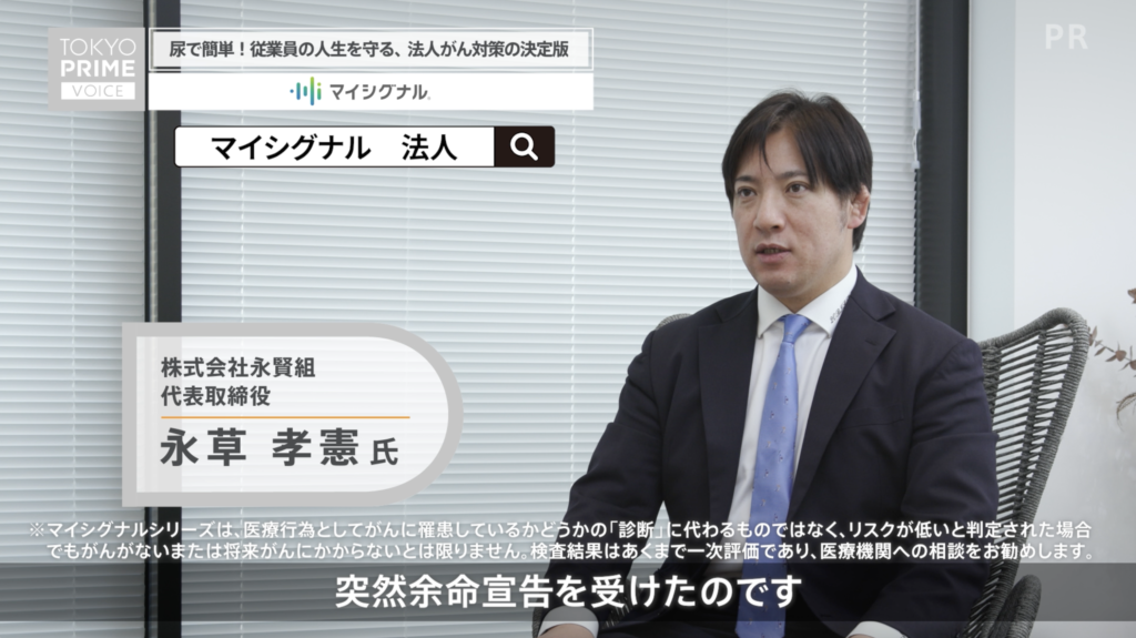 今回のCMでは、実際にマイシグナル・スキャンを全社員に全額負担で導入いただいた株式会社永賢組 代表取締役の永草 孝憲氏にご出演をいただきました。永草氏は、先代社長であるお父様や、社員の方をがんで亡くされたご経験から、がん対策をはじめとしたウェルビーイング向上の取り組みに力を入れていらっしゃいます。広告内では、マイシグナル導入を決めた想いを語っていただきました。