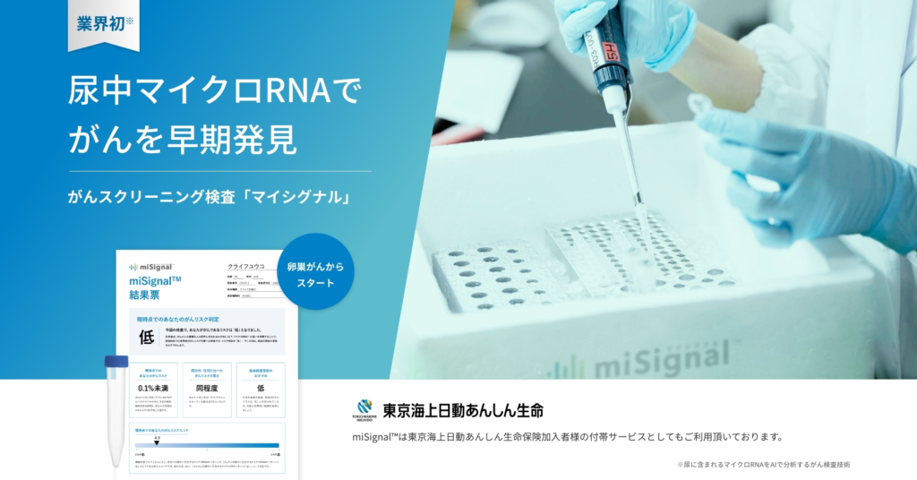 miSignal®️(マイシグナル)は、がんの発症や進行、転移に重要な役割を果たすマイクロRNA(以下miRNA)に着目したがんスクリーニング検査です。独自の技術により尿中の微量なmiRNAを効率よく捕捉し、早期のがんリスクも高い精度で検出します。本サービス最大の特長は“痛みがない”という点です。医療機関へ尿を提供するだけで、負担なく気軽にがんのリスクチェックを行っていただけます。現在、提供が開始されているマイシグナルの対象がん種は「卵巣がん」です。今後、研究開発の進捗とともに順次検査可能ながん種を増やしてまいります。詳細はWebサイト(https://misignal.jp/)をご覧ください。