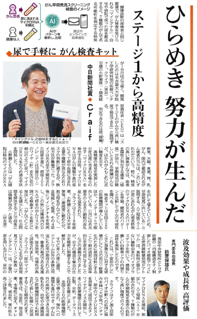 Craifの尿中マイクロRNAによるがん早期発見スクリーニング検査「マイシグナル®︎」が第37回中日産業技術賞で「中日新聞社賞」を受賞