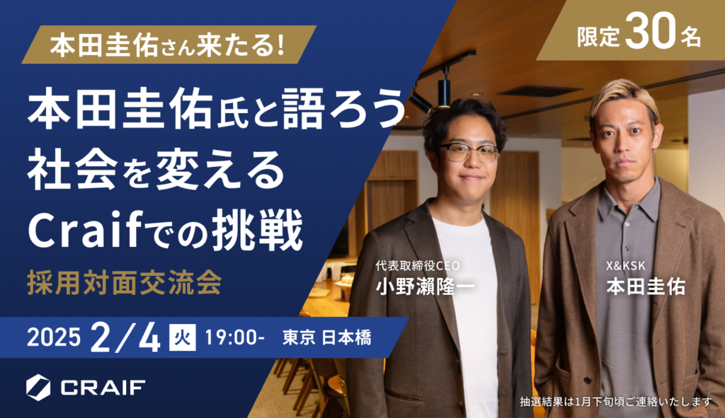 2/4実施決定!「本田圭佑氏と語ろう、社会を変えるCraifでの挑戦」~本田圭佑氏が率いるX&KSKが過去最大額で出資をしたCraifの採用対面交流会を開催~