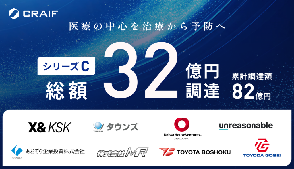 尿がん検査『マイシグナル』を提供するCraif株式会社(所在地:東京都文京区、CEO:小野瀨 隆一、以下Craif)は、シリーズCラウンドの2ndクローズが完了し、シリーズ全体での累計調達額が32億円(*1)に達したことをお知らせいたします。