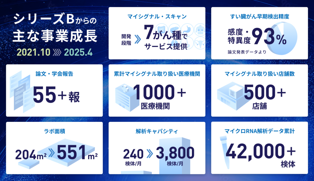 2021年10月のシリーズB資金調達時には「マイシグナル・スキャン」は開発段階でしたが、2022年2月のサービス開始後、全国1,000超の医療機関、500店舗超のドラッグストア・薬局に導入され、さらに企業の福利厚生プログラムやECチャネルを通じて急速にサービスを拡大しています。研究開発も含め、これまでに蓄積した検体データは4.2万件を超え、その研究成果を約60件の学術論文や学会報告として公表してきました。直近では、権威ある医学誌Lancet系列の「eClinicalMedicine」において、すい臓がんの早期かつ高精度な検出に関する成果を報告しています。また、管轄自治体の許可を取得して運営している衛生検査所は、その面積を従来の2倍に拡張し、解析能力も従来比で15倍以上に増強しました。さらに2024年4月には、すい臓がん診断を目的とする医療機器プログラムの薬事承認取得を目指した臨床試験を開始いたしました。