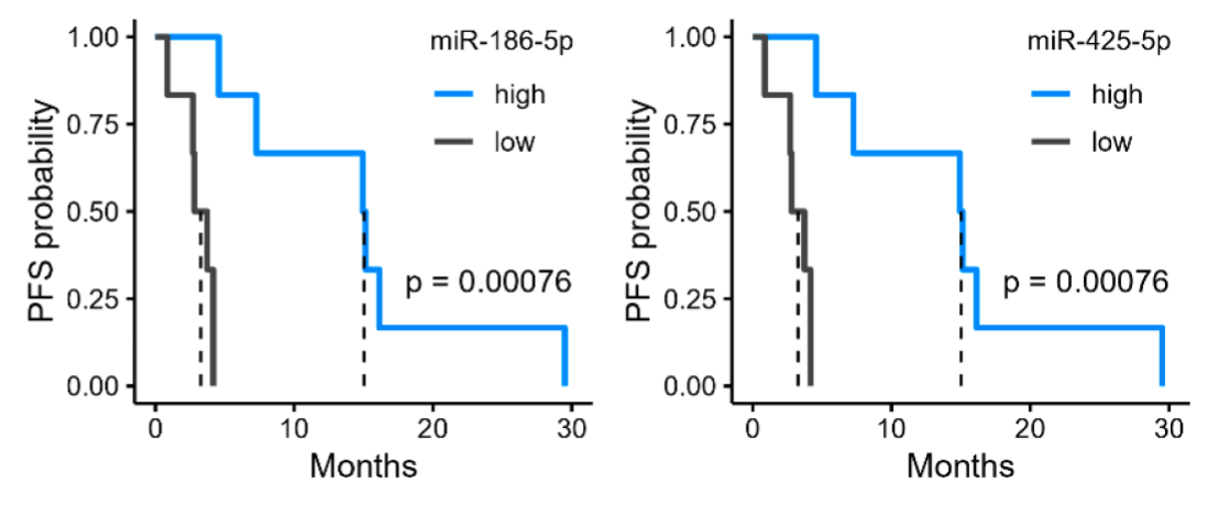 • 特に miR-186-5p と miR-425-5p の高発現は、無増悪生存期間(PFS)の有意な延長と関連し、有効性予測マーカーとしての臨床的有用性が示唆された。