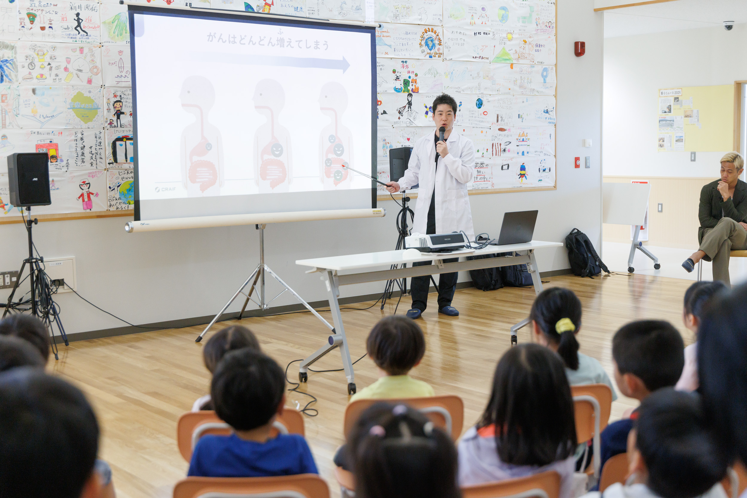 次にCTO 市川が「家族みんなの健康を考えよう」をテーマにお話いたしました。「がん」ってなんだろう 子どもたちに身近な病気である虫歯を例にあげ、「ならないのが一番大切。でももしなってしまったら、早く見つけて早く治すことがポイント」と伝えました。そして「これはどんな病気でも同じです。みなさんは『がん』って知っていますか?」と問いかけると、「いろんな臓器が悪くなる」などの答えが返ってきました。「がんは“体の中に悪いものがどんどん増えてしまう怖い病気”であり、虫歯と似ているけれど放っておくと体全体に広がってしまう点がやっかいです。また、がんは特に40歳以上で増えてくる病気なんです。」