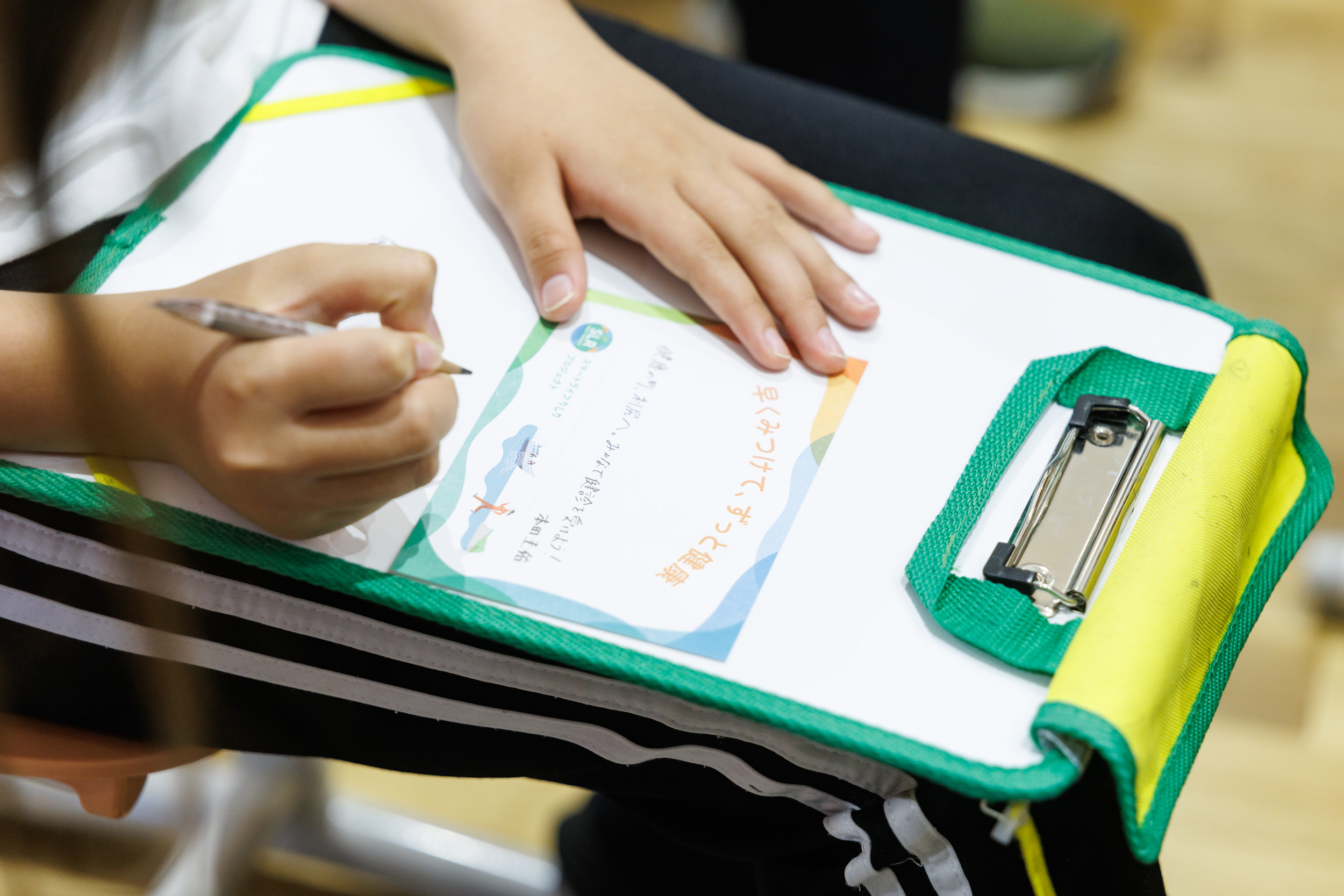 正解は「2人に1人」。答えを知ると子どもたちは「ええ〜!」とどよめきました。2問目は「がんを早く見つけると、長生きできる可能性はどれくらい上がるでしょう」で、答えは「10倍」。3問目の「がん検診を受けている人はどれくらい?」の答えは「半分もいない」でした。子どもたちからは「なんでそんなに受けないのー?」という声も上がりました。家族に「がん検診」を勧めよう最後に市川から、今日学んだがん検診について家族に伝えてほしいとメッセージを送りました。「虫歯にならないために、みんなは歯磨きをして、検査を受けて、早く治療しているよね。がんも、がんにならないように健康的な生活をすることが大事で、さらに早く見つけるために『がん検診』というものがあります。今は検診率が半分以下なので、これを変えていきたいんです。みんなの家族にずっと健康でいてもらいたいんです。ぜひ今日学んだことをお家に帰って家族の人にも伝えてほしいと思っています。『早く見つけて、ずっと健康』について、家族のみんなに話してほしいと思います。」家族へのメッセージそれぞれが家族に贈る、今日の話を聞いて考えた健康についてのメッセージカードを作成しました。子どもたちは「早くけんこうしんだん受けてね!しっかり運動もしてね!」「健康しんだんしっかり受けようね」といったメッセージを書き込んでいました。