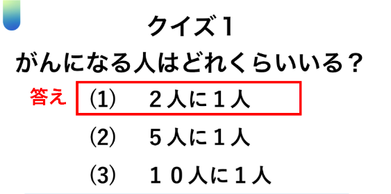 「がん」のクイズがんについてのクイズを3問出題。答えだと思う選択肢に手を挙げていただきました。