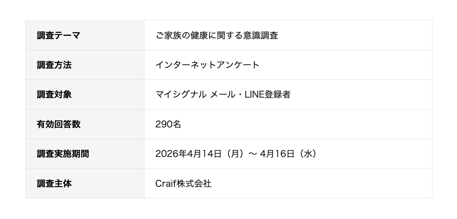 尿がん検査「マイシグナル®」を提供するCraif株式会社(所在地:東京都新宿区、代表取締役CEO:小野瀬 隆一、以下Craif)は、マイシグナル登録者290名を対象に実施した「ご家族の健康に関する意識調査」の結果を公開いたします。あわせて、母の日に向けた特別キャンペーン「お母さんに、“安心”を贈ろう。」を2026年4月23日(木)より開始することをお知らせいたします。
