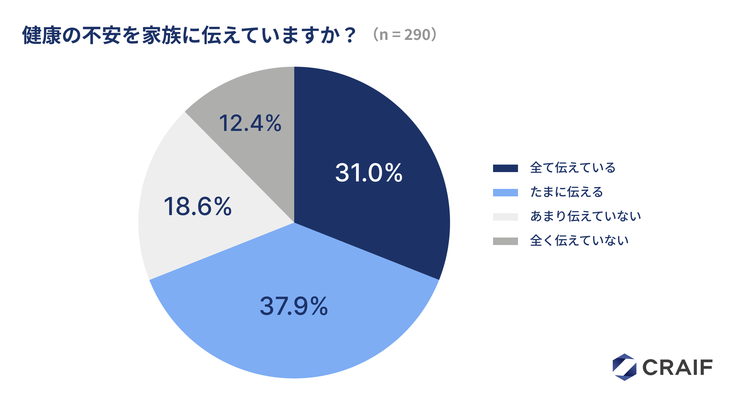 自身の体調面の不安や健康上の心配ごとを家族に伝えているか尋ねたところ、「全て伝えている」と回答したのは31.0%にとどまりました。「あまり伝えていない」19.0%、「全く伝えていない」12.0%を合わせると、約3人に1人が健康の不安を家族に伝えられていないことがわかりました。