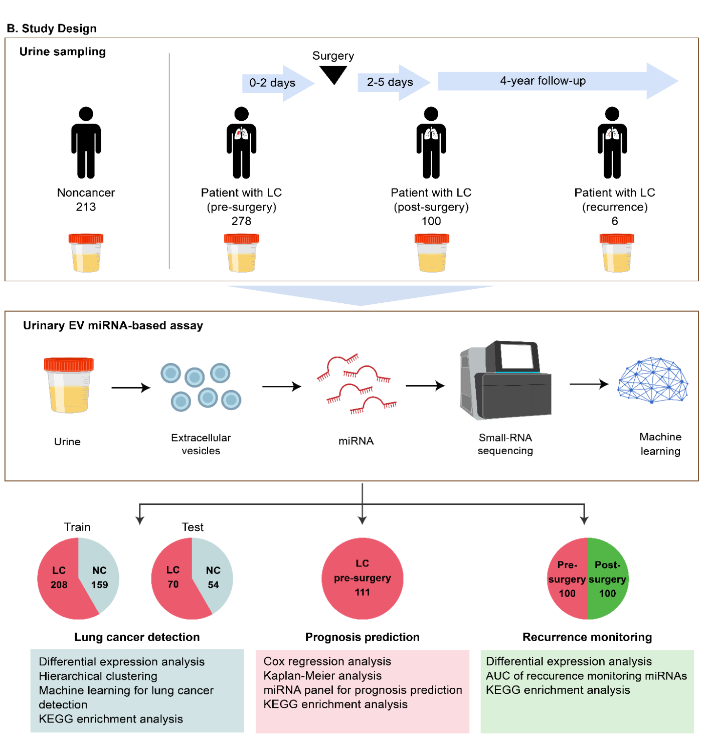 - 尿中マイクロRNA検査で早期肺がんを高精度に検出:尿中細胞外小胞由来のマイクロRNAを濃縮・解析し、機械学習モデルを構築することで、早期肺がんを高い精度で検出しました(テストセット:AUC0.941、早期ステージ感度88.2%、特異度87.0%)。