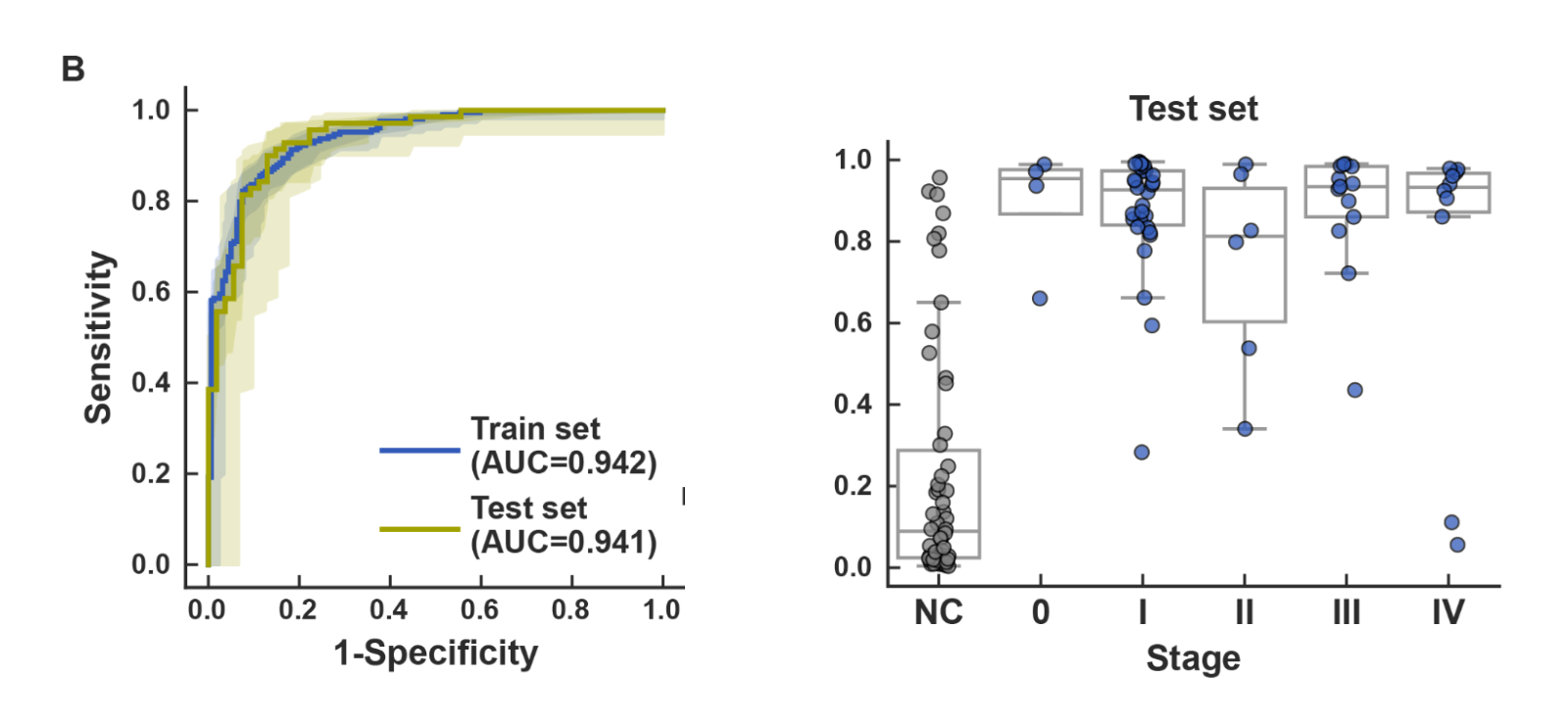 本研究では、4施設(慈恵医科大学病院、東大阪市立医療センター、北斗病院、大宮シティクリニック)から肺がん患者278名(うち早期ステージ〔ステージ0/I〕が約半数)と非がん者213名の尿サンプルを収集し、Small-RNAシーケンシングと機械学習を用いて解析しました。構築された肺がん検出モデルは、トレーニングセットでAUC 0.942、独立したテストセットでもAUC 0.941と高い性能を示しました。特に早期ステージの肺がんに対して、テストセットで感度88.2%、特異度87.0%を達成しました(図2)。また、予測スコアは年齢・性別・BMI・喫煙歴といった背景因子の影響を受けないことも確認されました。