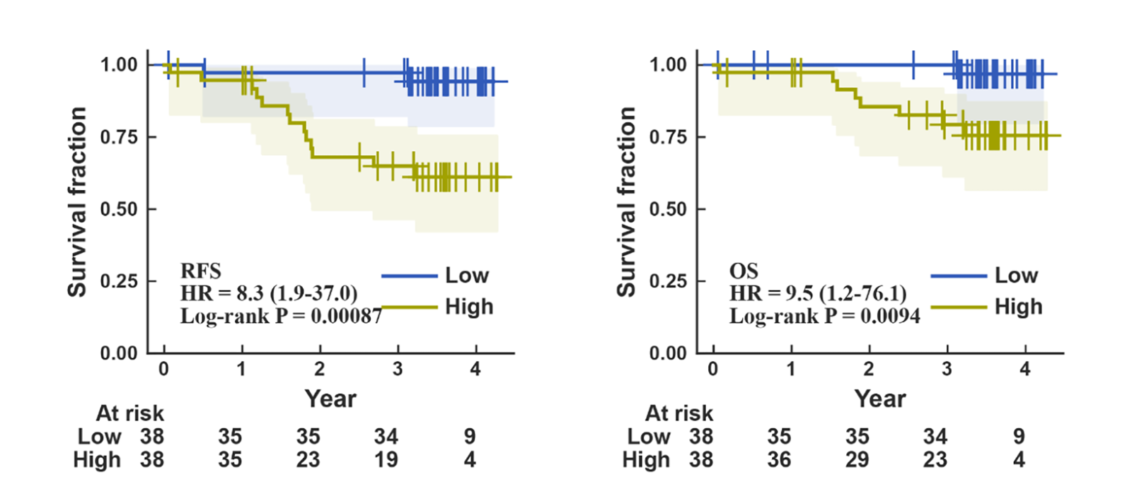 さらに、術後の再発リスク予測を目的として、ステージI/IIの肺がん患者76名を対象にCox回帰解析を実施しました。11種類のマイクロRNAが無再発生存期間と有意に関連しており、そのなかからhsa-miR-181a-5p、hsa-miR-185-5p、hsa-miR-934の3種パネルを構築しました。このパネルにより患者を高リスク群と低リスク群に層別化したところ、無再発生存期間(HR=8.3、p=0.00087)および全生存期間(HR=9.5、p=0.0094)のいずれにおいても、両群間に統計的に有意な差が認められました(図3)。